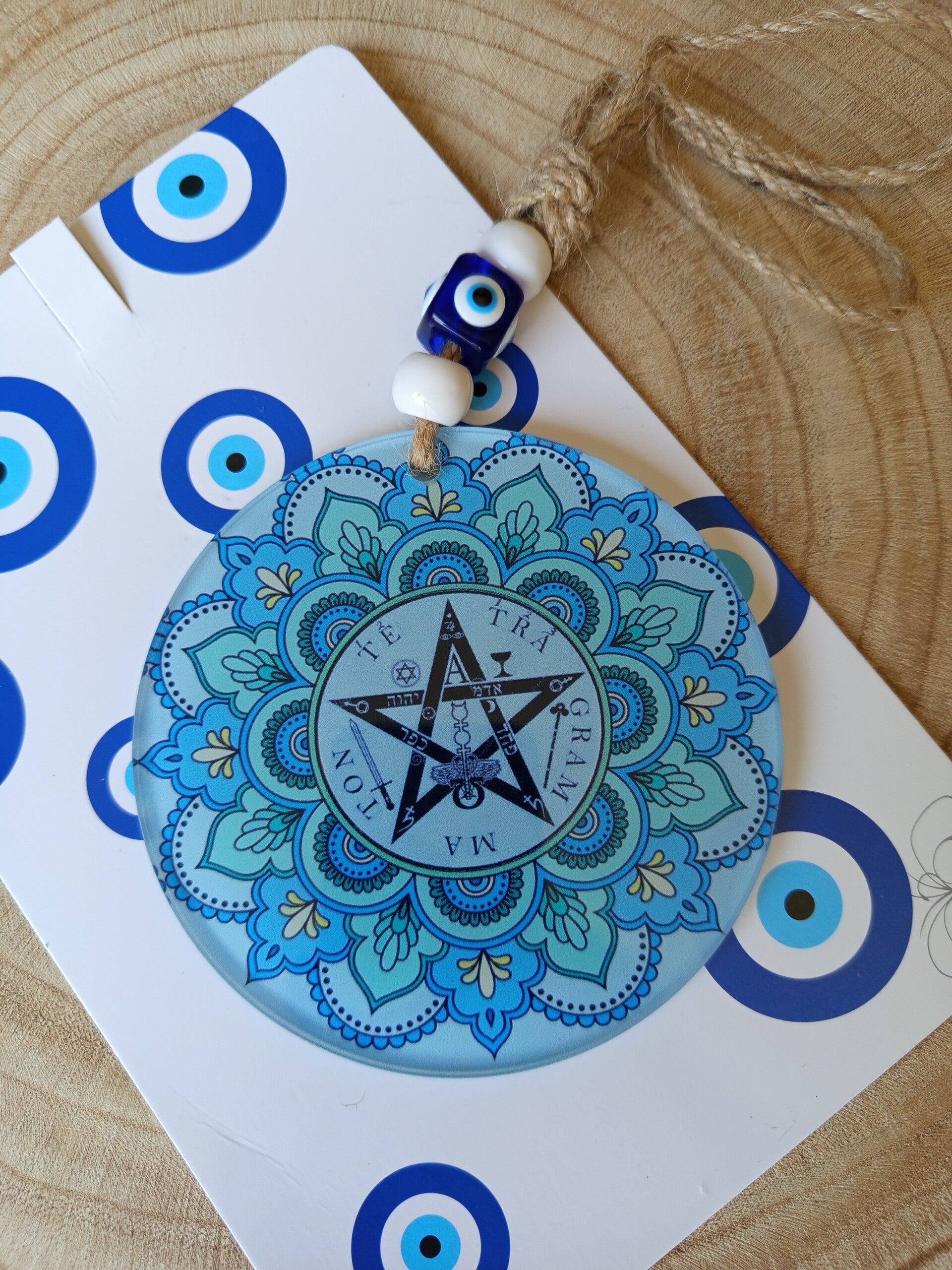 Eleva la energía de tu hogar con nuestro Colgante de Pared Tetragramatón de Cristal con Ojo Turco. Este hermoso adorno no es solo decorativo; es un amuleto con un significado profundo. El Tetragramatón, símbolo de la divinidad y la protección, se une al Ojo Turco, conocido por alejar las malas vibraciones. Una combinación perfecta de espiritualidad y estilo para tu pared.