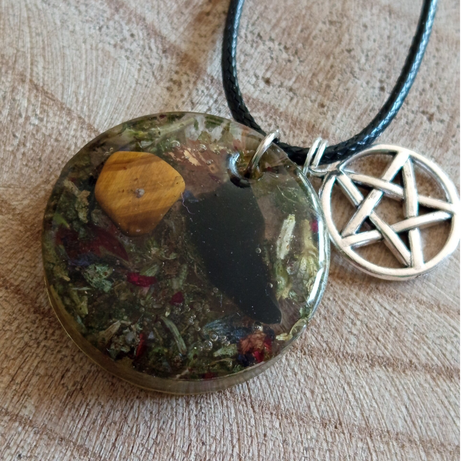 Descubre nuestro exclusivo Colgante "Esencia Protectora", una pieza única creada y ritualizada a mano por mí. Cada colgante está cuidadosamente elaborado con resina, encapsulando poderosos minerales como el Ojo de Tigre y la Turmalina Negra, junto con plantas sagradas seleccionadas.